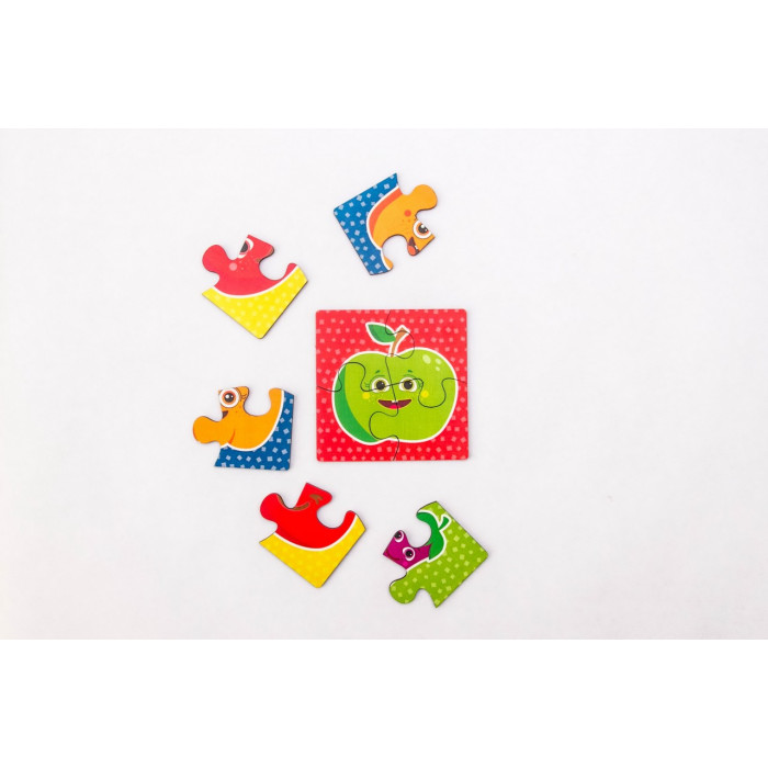 Ваш малыш с удовольствием будет рассматривать яркие тематические изображения пазлов и пробовать соединять замысловатые детали между собой. Терпение и небольшая помощь взрослого очень быстро принесут свои плоды, ребенок научится собирать замечательные картинки, которые состоят из 4 деталей.