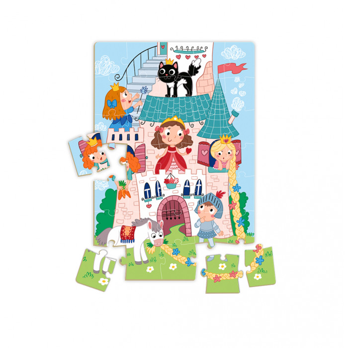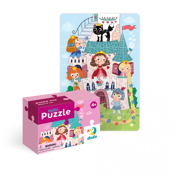 Пазл-мини "Маленькие принцессы" представляет собой изображение четырех принцесс в башне и маленького рыцаря.