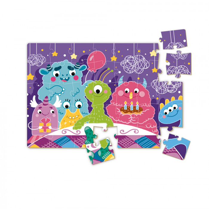 Пазл-мини "День рождения" представляет собой изображение дружелюбных монстриков, весело отмечающих праздник.