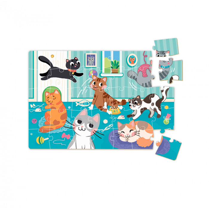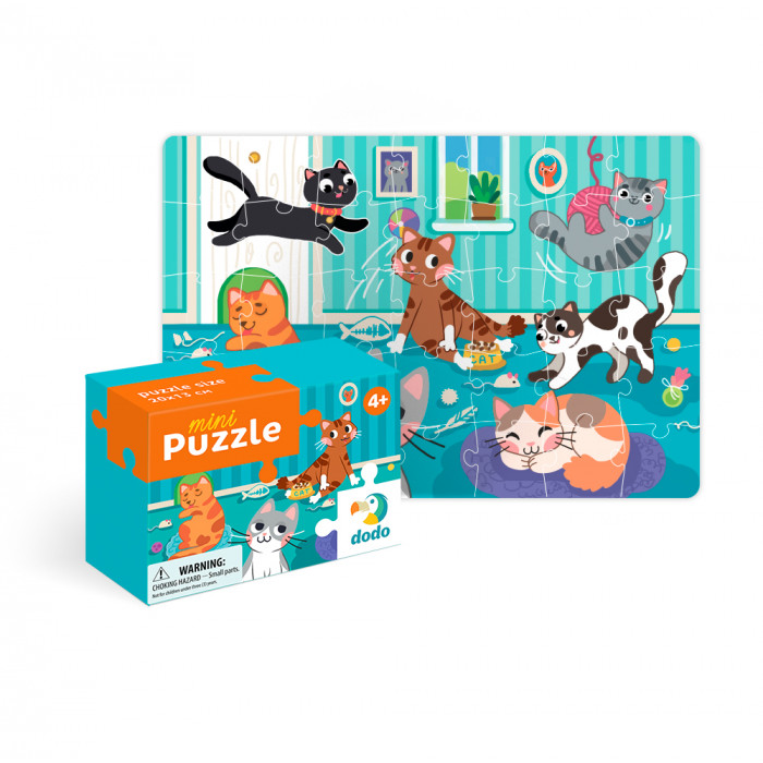 Пазл-мини "Котики" представляет собой изображение 7 милых котиков, резвящихся в комнате.