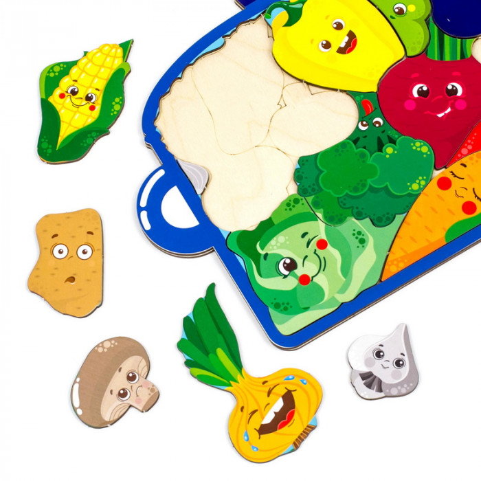 Пазл-головоломка "Кастрюля с овощами" - развивающая игрушка для любознательных непосед, которая учит воспринимать связь между целой картинкой и ее частями.