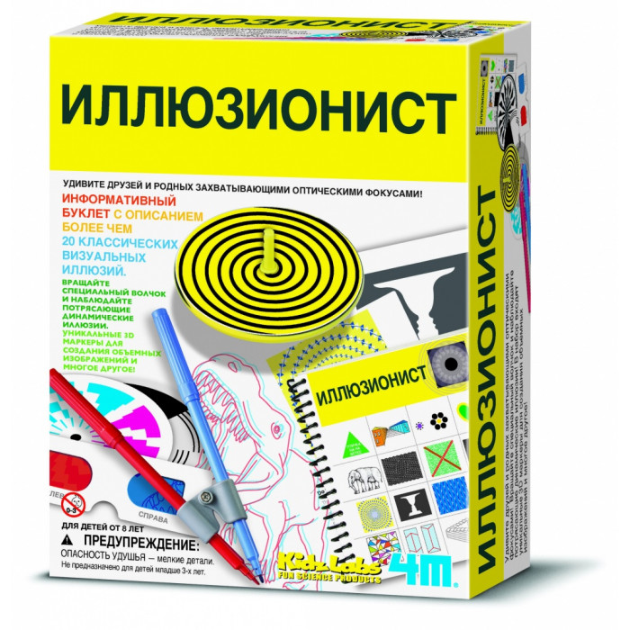 Разработчики 4М подготовили для вас 20 удивительных оптических иллюзий, которые способны заворожить и взрослых, и детей. Также в набор вошли иллюзионные волчки, 3D-картинки и инструменты для создания трехмерных изображений. Магический комплект дополнен подробной инструкцией с пояснениями.