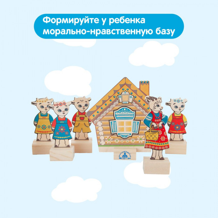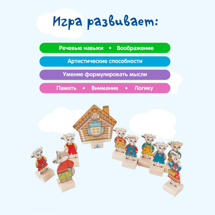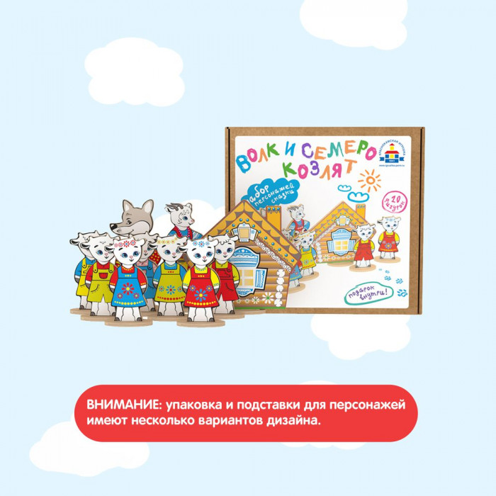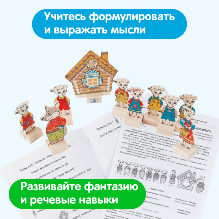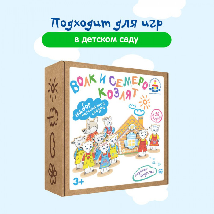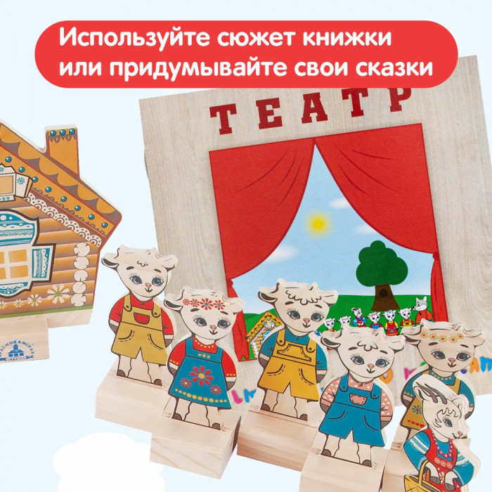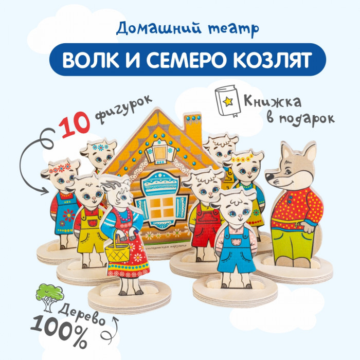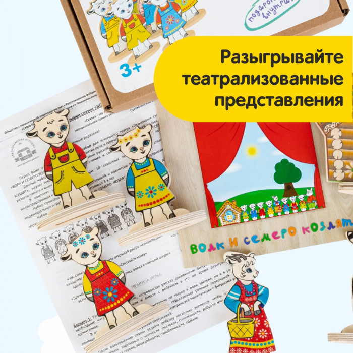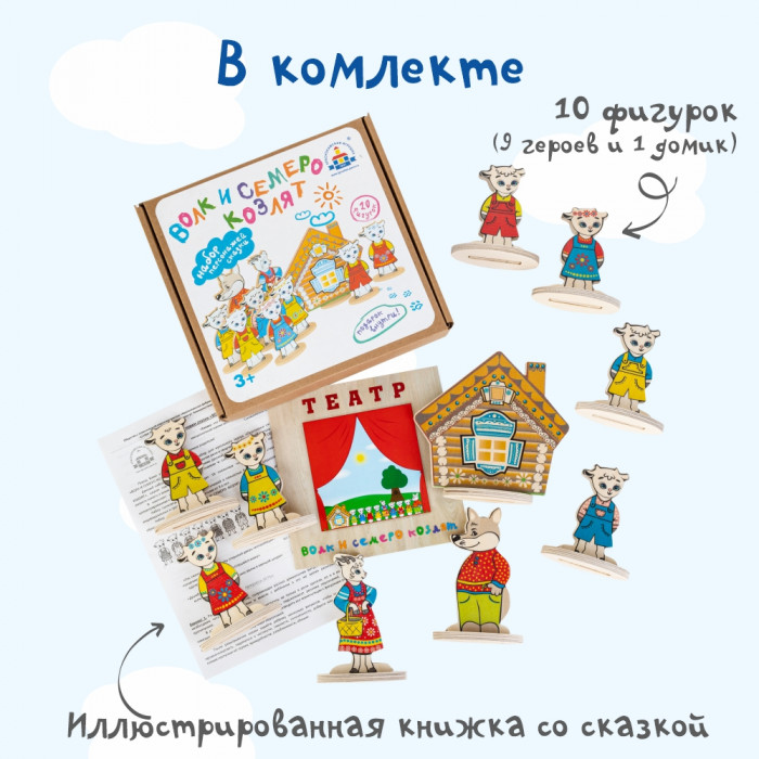 Комплект для кукольного театра по мотивам сказки "Волк и семеро козлят" - увлекательный и развивающий досуг для детей в возрасте от трех лет. В набор входят фигурки козлят, их мамы, волка и домика (все фигурки на подставках), а также иллюстрированная книжка с текстом сказки.
