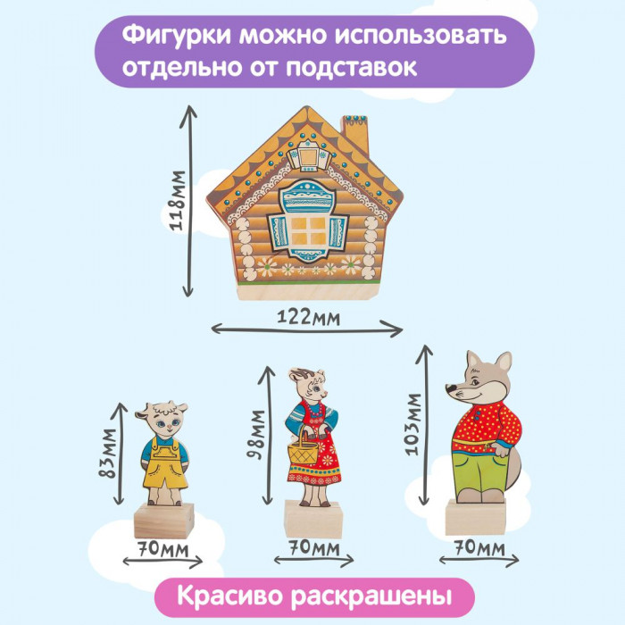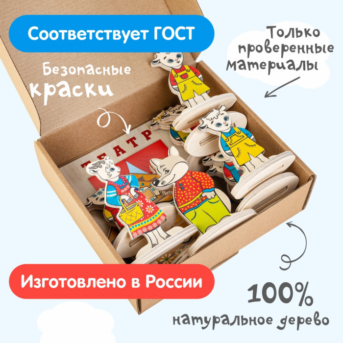 Все фигурки изготовлены из натуральной и безопасной древесины, покрыты акриловыми красками. Краска экологична и не стирается во время интенсивного использования фигурок – набор долго сохраняет свою привлекательность и всегда будет интересен детям.Игрушка сертифицирована и рекомендована для детских дошкольных учреждений.