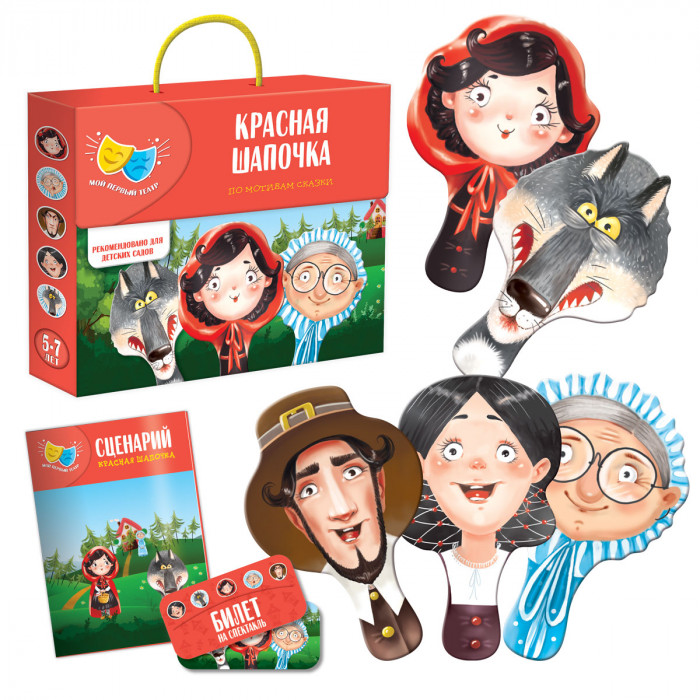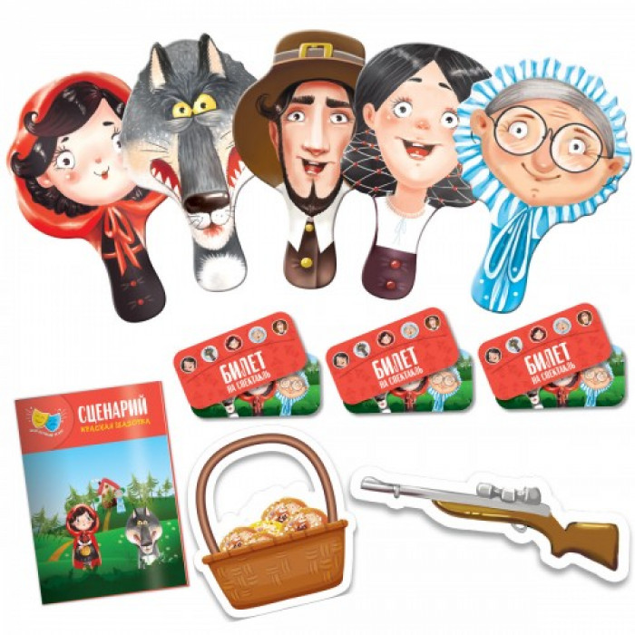 Устройте самую настоящую театральную постановку у себя дома! Раздайте друзьям билеты на спектакль, и скорее к игре!Распределите роли и следуйте по тексту сценария "Красная Шапочка". Чтобы провести время весело и максимально вжиться в роль, используйте маски персонажей. Они двухсторонние. На каждой из сторон изображен либо тот же герой, но уже с другой эмоцией, либо новый второстепенный персонаж. Также в наборе есть дополнительные элементы, которые помогут разнообразить процесс игры!