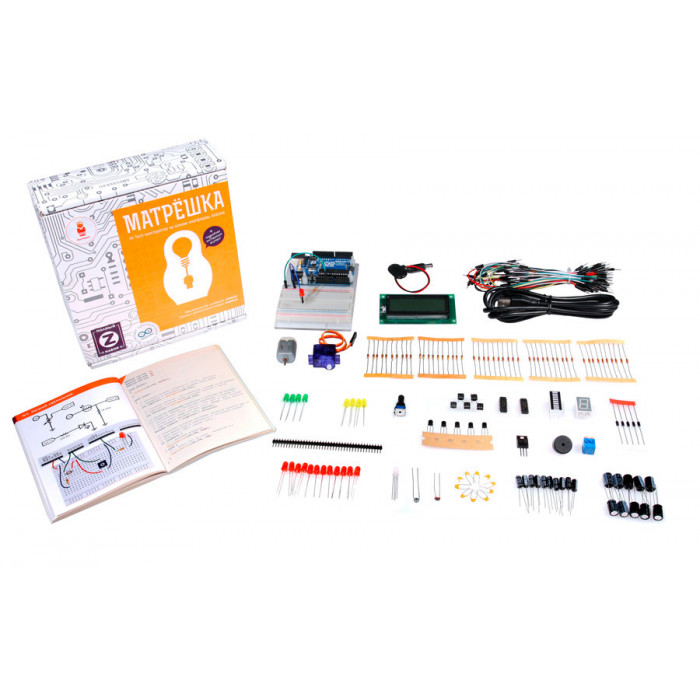Если вы хотите начать работать с Arduino, но у вас нет опыта и нет базовых радиодеталей и приспособлений, набор "Матрёшка" — это лучший выбор. В нём вы найдёте самую распространённую платформу Arduino Uno, набор радиодеталей, провода, макетную плату, а самое главное — красочную лаконичную обучающую брошюру, которая с нуля научит вас делать собственные электронные устройства.