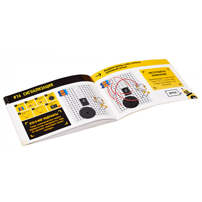 Далее идут эксперименты. Каждый эксперимент — это маленькое электронное устройство с описанием принципа его работы. Постепенно конструктор рассказывает обо всех используемых компонентах: зачем они нужны и как устроены. Вот какие эксперименты включены в набор: