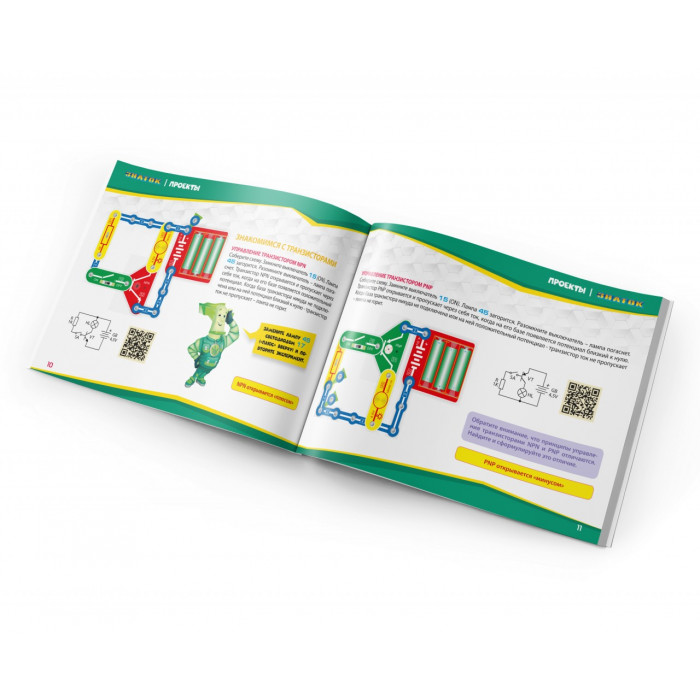 Руководство с описанием схем располагается в коробке под прозрачной монтажной платой. Нижняя часть коробки вместе с деталями и книгой запечатана в полиэтиленовую пленку.