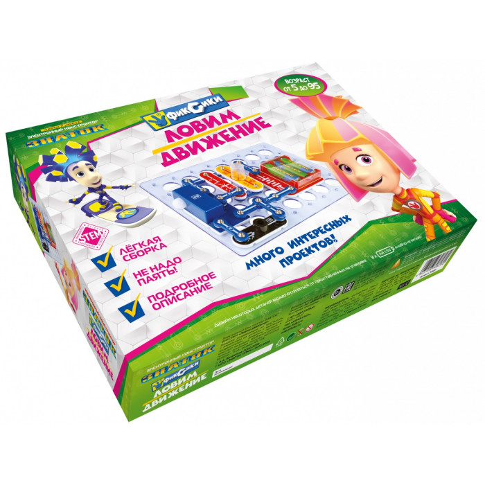 Электронный конструктор начального уровня, позволяющий ребенку понять, как работают многие "умные вещи" вокруг нас, и в частности, исследовать схемы с датчиком движения, который используется в реальной жизни для охраны помещений или автоматического включения оборудования.