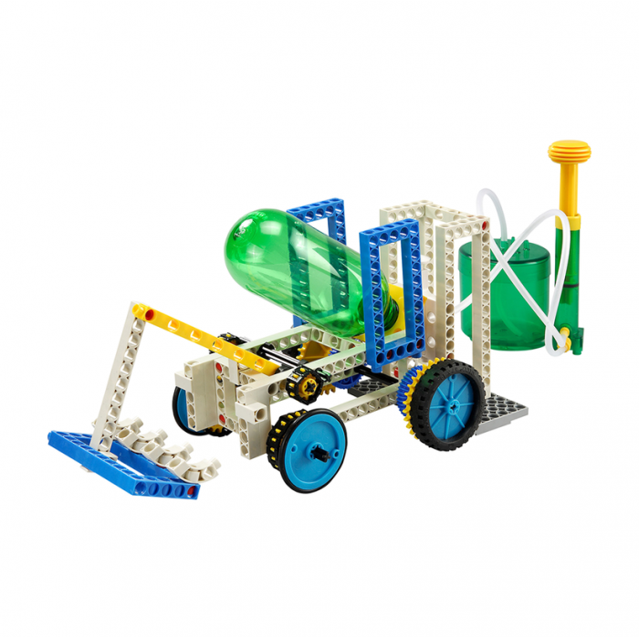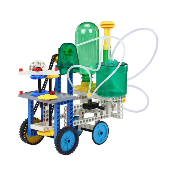 Готовые модели — не просто подобие вертолета, мотоцикла или мельницы. Это действующие механизмы. Они работают за счет гидропневматики (энергии воды и воздуха). С помощью насоса вода из накопителя попадает в специальную емкость. Опуская рычаг переключателя, вы отправляете воду на шестеренки — они начинают вращаться и приводят в движение колеса машины.