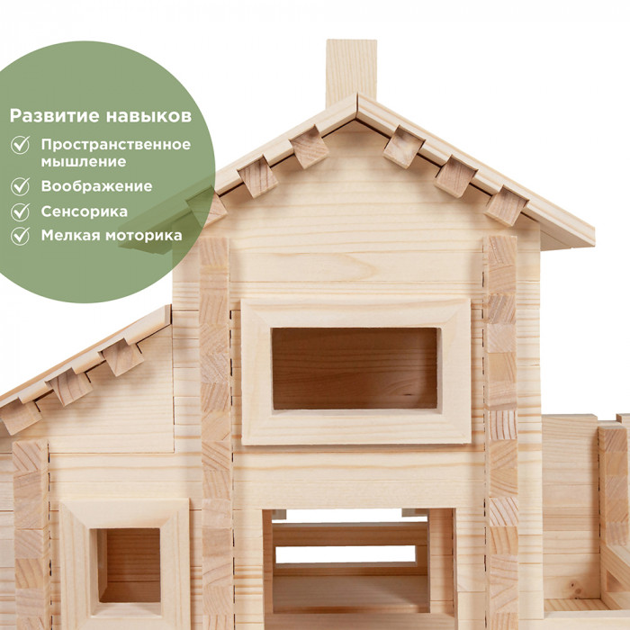 Комплект содержит более 300 деревянных брусочков и строительных элементов, из которых вы и ваш ребенок сможете смастерить невероятно реалистичные бревенчатые терема в 1, 2 и даже 3 этажа!