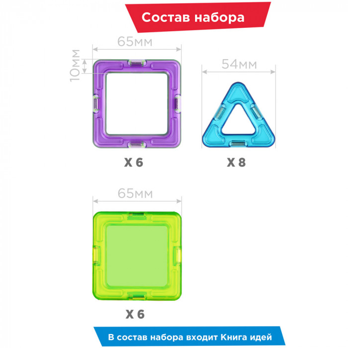 Отличный стартовый набор, который можно смело порекомендовать детям, только начинающим своё общение с семейством конструкторов Magformers. В состав набора входят базовые фигуры Magformers: 8 треугольников, 6 квадратов и 6 прозрачных квадратов. Ребенок научится различать геометрические фигуры, цвета, сможет освоить новый мир форм. А красочная Книга идей подскажет, с чего начать.