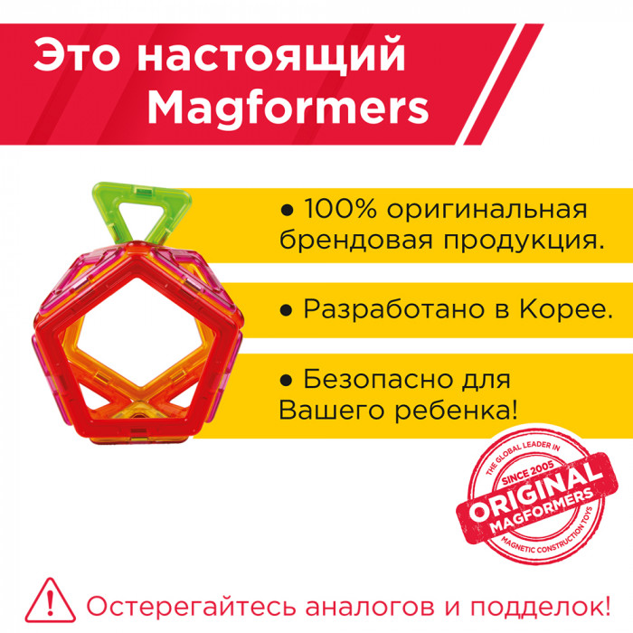 Магформерс — это развивающий магнитный конструктор нового поколения. Магнитные детали разнообразных геометрических форм складываются в самые невероятные модели: башни и роботы, животные и автомобили — Магформерс развивает интеллект и воображение ребенка.