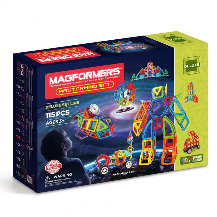 В набор входят плоские и объемные магнитные детали, а также основные аксессуары (колеса, пропеллер, антенна, колесо обозрения, строительные аксессуары). Создание разнообразных тематических моделей из Magformers Mastermind set поможет ребенку развить творческие способности и воображение.