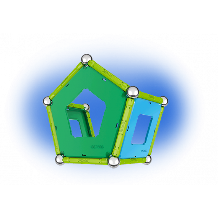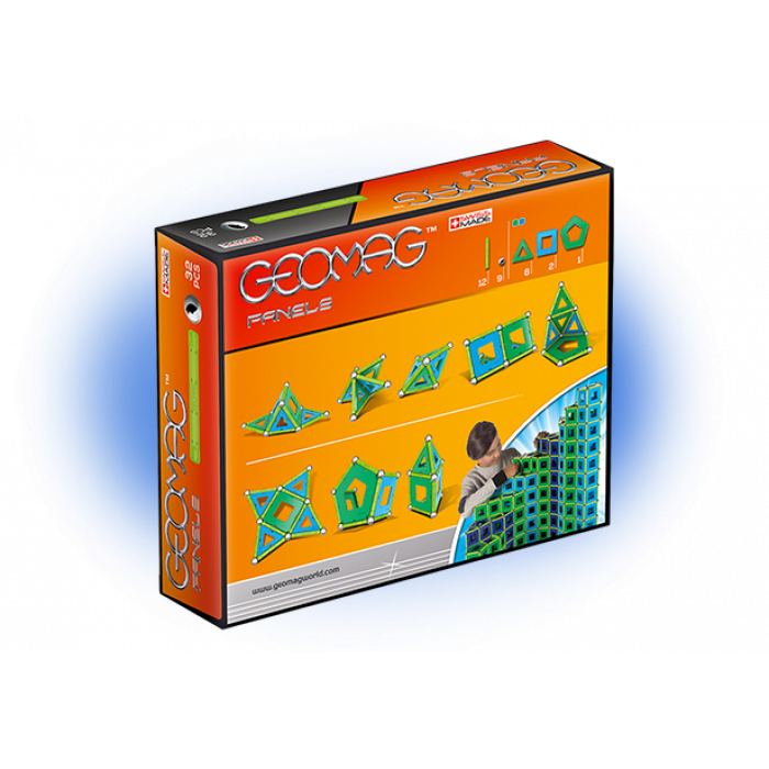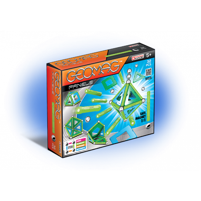 Магнитный конструктор серии Panels. В комплекте 32 детали. Помимо стандартных стрежней и шариков, в набор входят пластиковые панели (треугольники, квадраты, пятиугольники). Они укрепят и разнообразят постройки из GEOMAG.