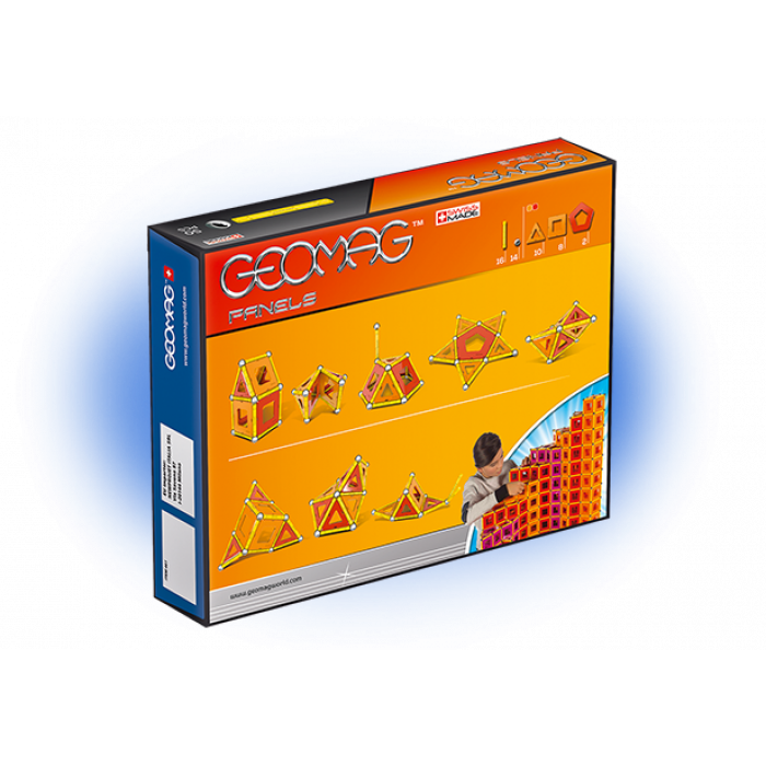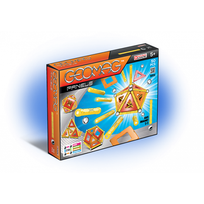 Магнитный конструктор серии Panels. В комплекте 50 деталей. Помимо стандартных стрежней и шариков, в набор входят пластиковые панели (треугольники, квадраты, пятиугольники). Они укрепят и разнообразят постройки из GEOMAG.