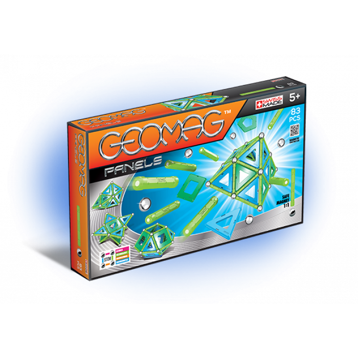 Магнитный конструктор серии Panels. В комплекте 83 детали. Помимо стандартных стрежней и шариков, в набор входят пластиковые панели (треугольники, квадраты, пятиугольники). Они укрепят и разнообразят постройки из GEOMAG.