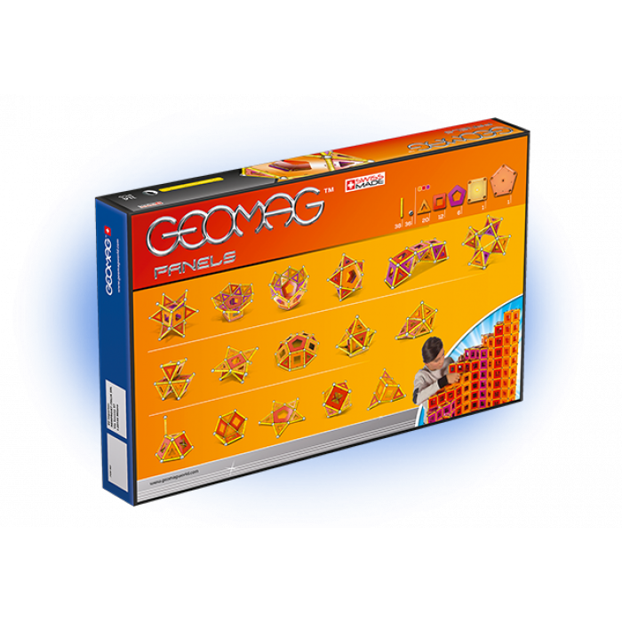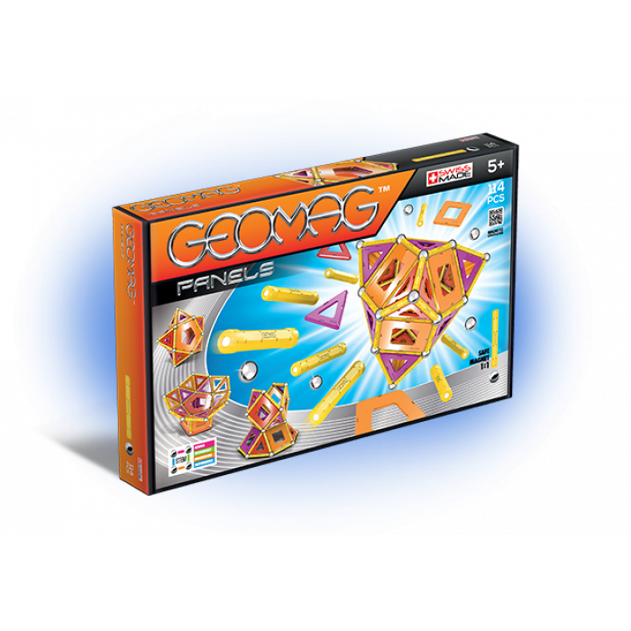 Магнитный конструктор серии Panels. В комплекте 114 деталей. Помимо стандартных стрежней и шариков, в набор входят пластиковые панели (треугольники, квадраты, пятиугольники). Они укрепят и разнообразят постройки из GEOMAG.
