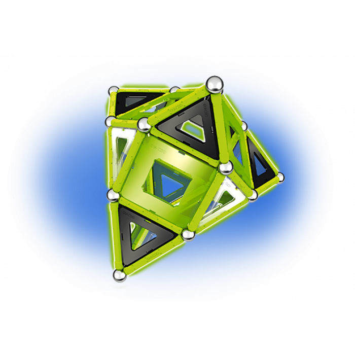 Светящийся магнитный конструктор серии Glow. В комплекте 104 детали (стержни, шарики и пластиковые панели). Стержни святятся в темноте, превращая игру с GEOMAG в волшебство.