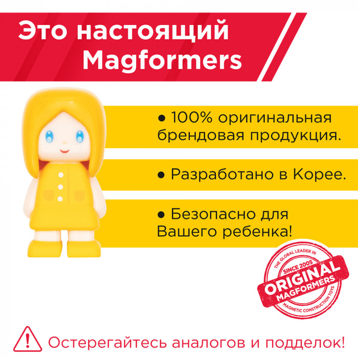Детали Магформерс изготовлены из очень прочного и эластичного пластика, который нелегко сломать и взрослому человеку. Ваш ребенок не поранится острыми краями обломков и не доберется до маленьких магнитов внутри! Наборы Магформерс проходят тщательный контроль качества и безопасности и получили все необходимые сертификаты по российским и международным стандартам. Магформерс постоянно совершенствует технологии производства, делая конструктор еще более надежным и качественным. Играть с Магформерс весело и безопасно!