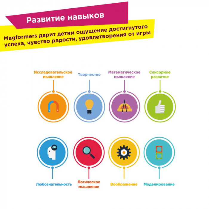 Магформерс обладает уникальным развивающим потенциалом и подходит для игры и занятий с самого раннего возраста. Работа с деталями улучшает мелкую моторику, а постройка объемных фигур развивает пространственное и абстрактное мышление. Возможности для раскрытия творческих способностей ребенка с Магформерс практически безграничны: из магнитных деталей можно собрать самые невероятные и фантастические модели.