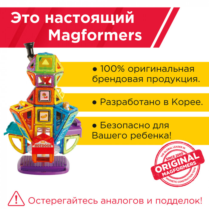 Magformers — это тот самый, первый и оригинальный, конструктор из магнитных треугольников и квадратов. Он был изобретен в США еще в 2005 году. Сегодня настоящий Magformers проектируется в Южной Корее и популярен по всему миру.