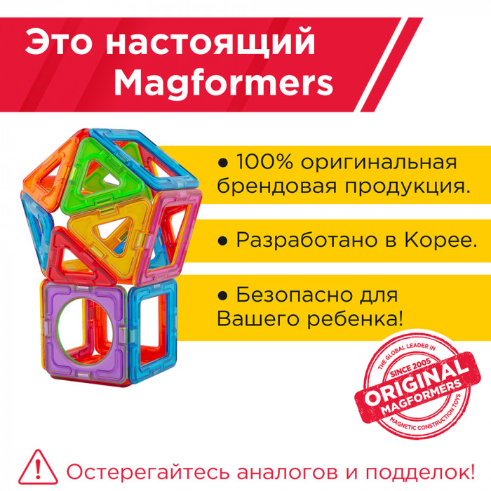 Magformers — это тот самый, первый и оригинальный, конструктор из магнитных треугольников и квадратов. Он был изобретен в США еще в 2005 году. Сегодня настоящий Magformers проектируется в Южной Корее и популярен по всему миру.