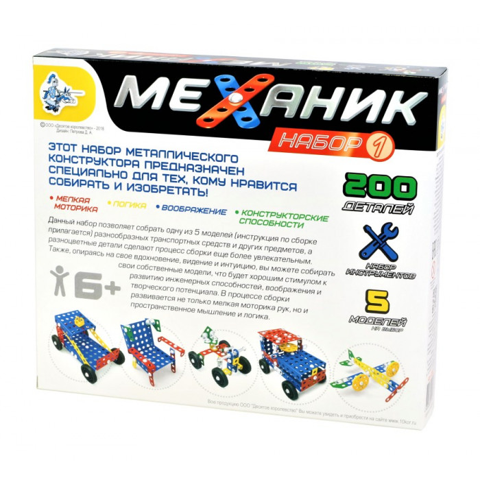 Отличие данного набора, как и всей серии "Механик", от остальных конструкторов "Десятого королевства" в том, что оцинкованные детали окрашены в 4 основных цвета — темно-синий, желтый, зеленый и красный.