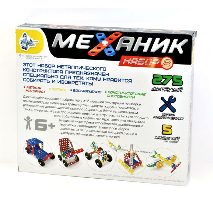 Отличие данного набора, как и всей серии "Механик", от остальных конструкторов "Десятого королевства" в том, что оцинкованные детали окрашены в 4 основных цвета — темно-синий, желтый, зеленый и красный.
