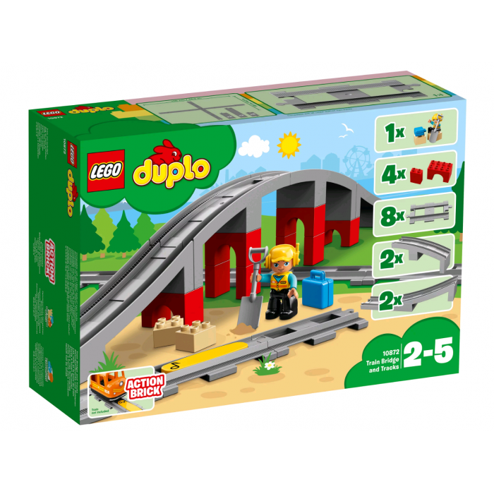 Набор "Железнодорожный мост" (10872) от LEGO® DUPLO® дополняет наборы DUPLO железнодорожной тематики. С ним еще больше возможностей для игры! Постройте высокий мост и проложите железнодорожные пути по любому маршруту. Помогите ребёнку установить жёлтый активирующий кубик на рельсы, чтобы проезжающий по нему поезд DUPLO издавал звуковой сигнал. Набор также включает в себя фигурку ремонтного работника LEGO® DUPLO®, два кирпича, лопату и чемодан, с помощью которых можно разыгрывать разные сценки и истории.