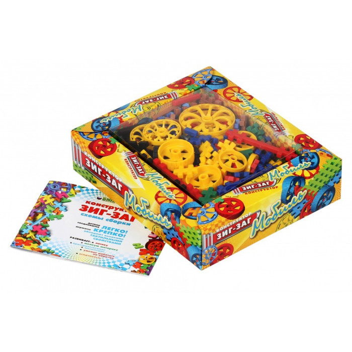 Конструктор "Зиг-Заг Мобиль" продолжение серии развивающих конструкторов "Зиг-Заг". В набор добавлены пять новых дополнительных деталей: колёса машинные, каретные - большое и малое, плашка большая, длинная ось для колёс.