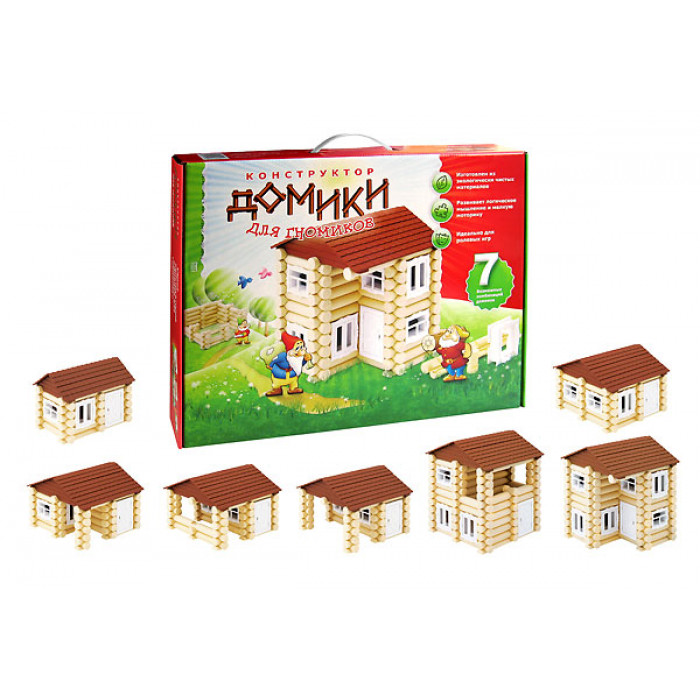 Конструктор "Домик для гномика" — это аккуратные бревнышки, из которых собирается красивый домик. Инструкция расскажет ребенку, как построить семь вариантов домов и загон для животных.