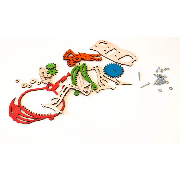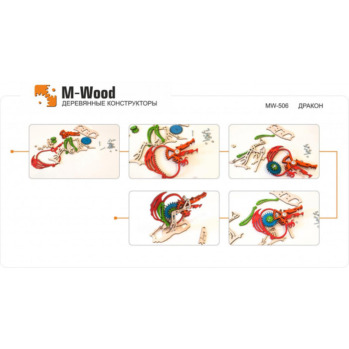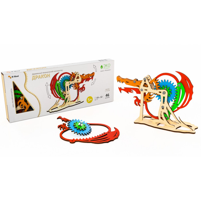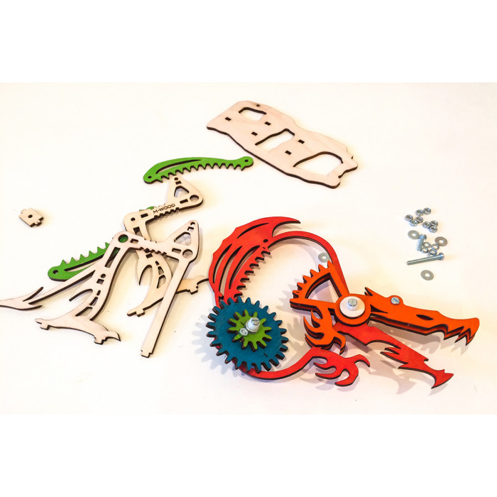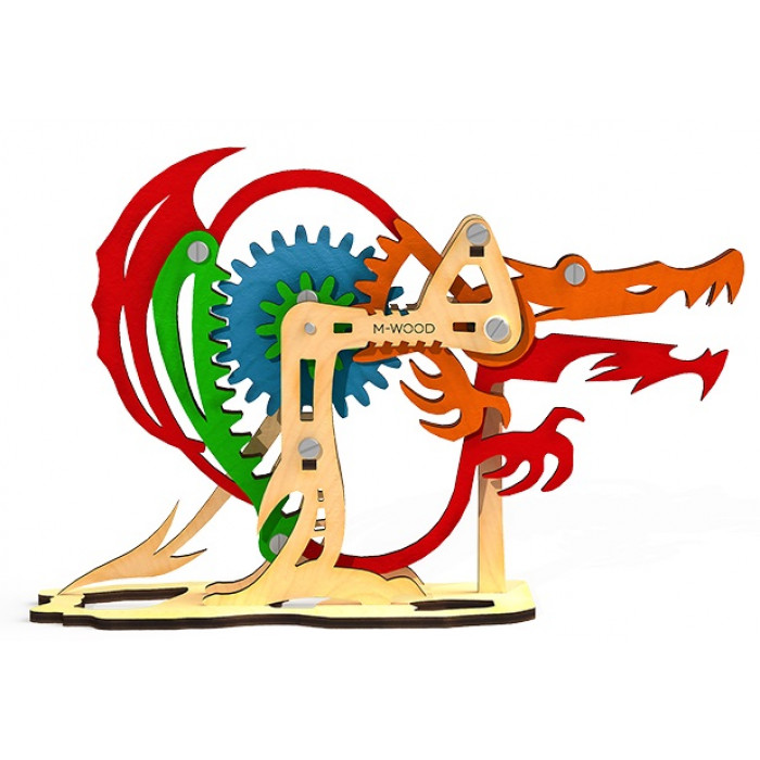 Деревянный конструктор "Дракон" приводится в действие подъёмом крыла. При подъёме крыла начинает вращаться зубчатый механизм, который раскрывает челюсти дракона. При опускании крыла дракон сжимает мощные челюсти обратно. Если приручить зверя, то в его челюстях можно удобно зажать важную записку или визитку.