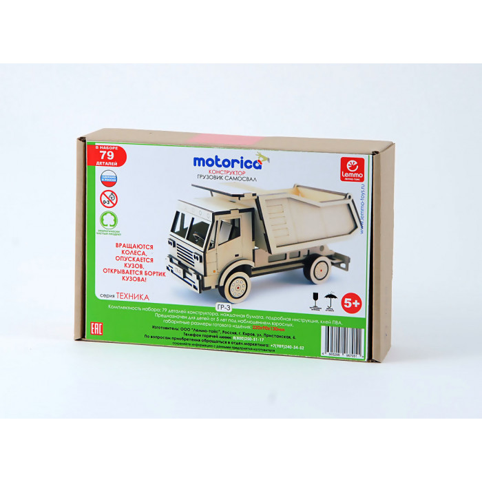 Экологически чистые, развивающие конструкторы от российского производителя "Lemmo" помогут вашему ребенку развить мелкую моторику рук, воображение, пространственное мышление, логику и предметное моделирование. Все детали выполнены из качественной древесины и имеют сильный насыщенный запах дерева. Наборы укомплектованы клеем ПВА и наждачной бумагой. Любой конструктор после сборки можно раскрасить акриловыми и гуашевыми красками, но даже без этого в результате получается полноценная красивая игрушка с подвижными элементами. Набор Грузовик самосвал станет отличным подарком для маленьких любителей строительной техники. Этот небольшой набор, средний по уровню сложности, рекомендован детям от 5 лет. В собранном виде у грузовика крутятся колеса и откидывается кузов.