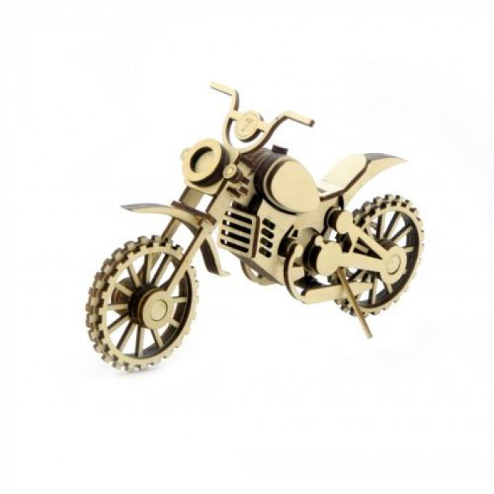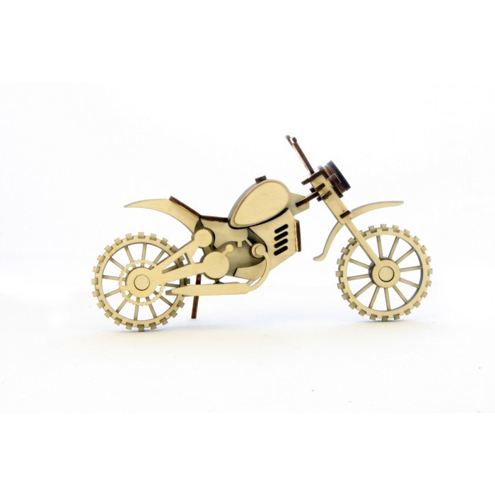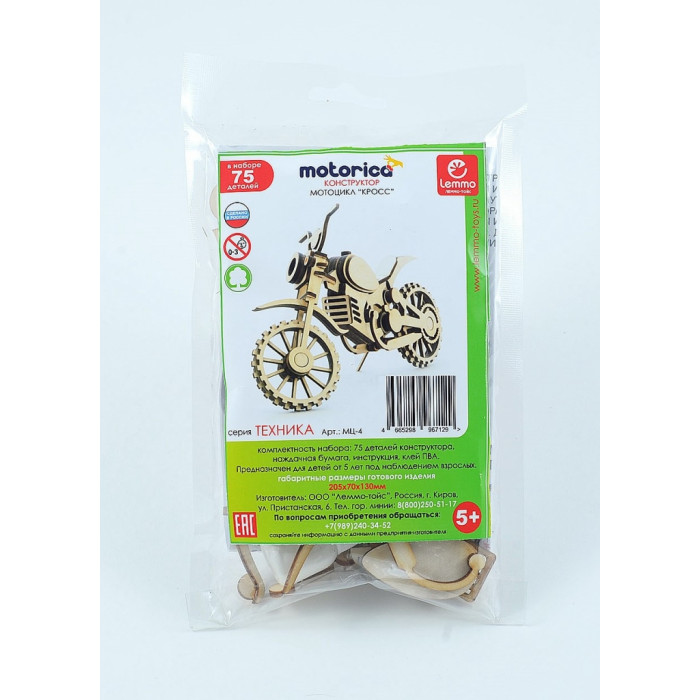 Экологически чистые, развивающие конструкторы от российского производителя "Lemmo" помогут вашему ребенку развить мелкую моторику рук, воображение, пространственное мышление, логику и предметное моделирование. Все детали выполнены из качественной древесины и имеют сильный насыщенный запах дерева. Наборы укомплектованы клеем ПВА и наждачной бумагой. Любой конструктор после сборки можно раскрасить акриловыми и гуашевыми красками, но даже без этого в результате получается полноценная красивая игрушка с подвижными элементами. Набор "Мотоцикл Кросс" рекомендуется детям от 5 лет. У собранной модели крутятся колеса и руль.