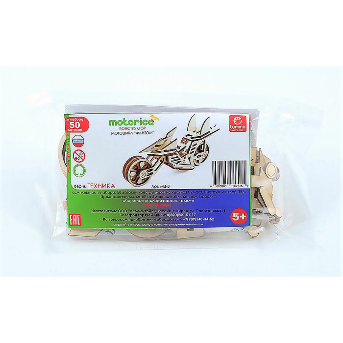 Экологически чистые, развивающие конструкторы от российского производителя "Lemmo" помогут вашему ребенку развить мелкую моторику рук, воображение, пространственное мышление, логику и предметное моделирование. Все детали выполнены из качественной древесины и имеют сильный насыщенный запах дерева. Наборы укомплектованы клеем ПВА и наждачной бумагой. Любой конструктор после сборки можно раскрасить акриловыми и гуашевыми красками, но даже без этого в результате получается полноценная красивая игрушка с подвижными элементами. Набор "Мотоцикл Фантом" рекомендуется детям от 5 лет. У собранной модели крутятся колеса.