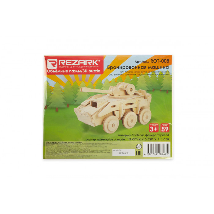 В каждый набор входит пошаговая инструкция на русском языке. Пазлы представляют собой небольшие сборные 3D модели из плоских фанерных деталей. Толщина фанеры — 3 мм.