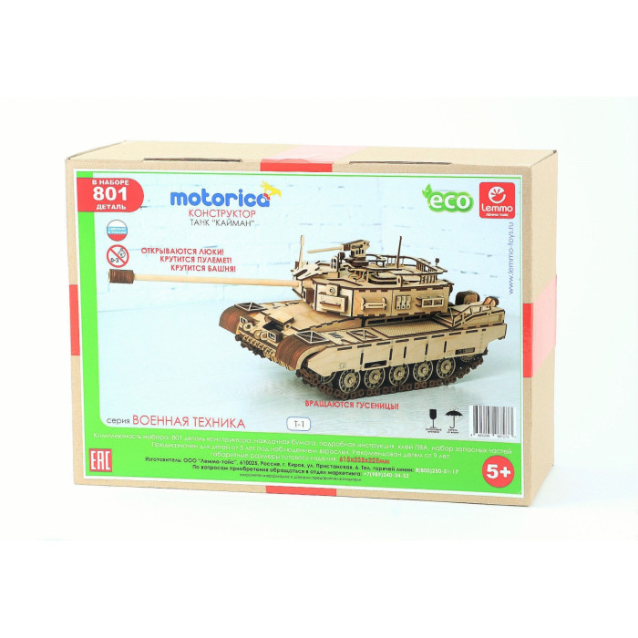 Экологически чистые, развивающие конструкторы от российского производителя "Lemmo" помогут вашему ребенку развить мелкую моторику рук, воображение, пространственное мышление, логику и предметное моделирование. Все детали выполнены из качественной древесины и имеют сильный насыщенный запах дерева. Наборы укомплектованы клеем ПВА и наждачной бумагой. Любой конструктор после сборки можно раскрасить акриловыми и гуашевыми красками, но даже без этого в результате получается полноценная красивая игрушка с подвижными элементами. Танк "Кайман" Леммо - это интересный конструктор для детей и для взрослых, а также для любителей моделизма. Танк сделан очень реалистично, в собранном виде имеет габариты 61,5х23,5х22,5 см, у танка вращаются гусеницы, башня, пулемет и дуло, открываются люки. Абсолютно все детали выполнены из дерева, гусеницы собираются из множества мелких перемычек, поэтому танки лучше ездят по ковровым покрытиям или по поверхностям с небольшой шероховатостью. Это с