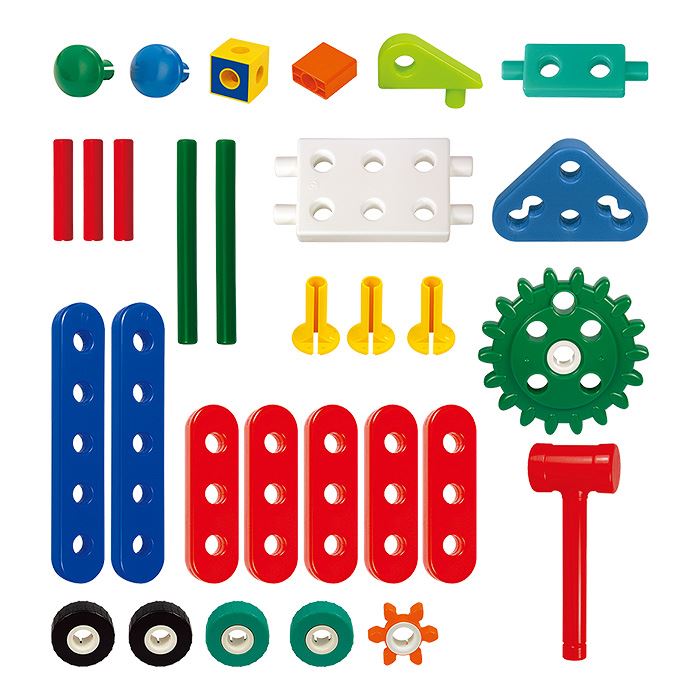 Элементы конструктора: панели и балки, болты, гайки, колеса, полусферы, шестеренки двух видов - маленькие с шестью зубчиками и большие с восемнадцатью зубьями