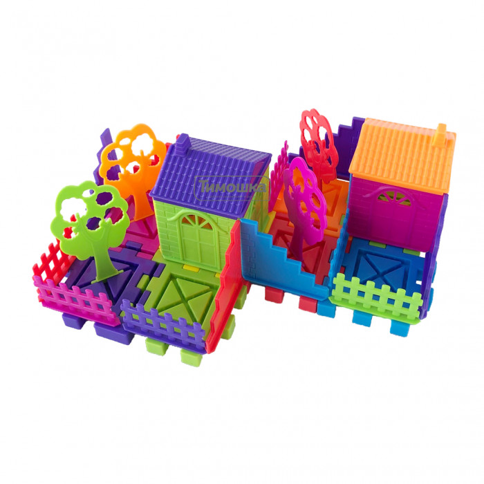 В наборе имеются такие детали как: деревья, заборы, домики, которые собираются из стен, окон, дверей и крыши. Также есть основа для пола, из которой можно создать отдельные фигуры.