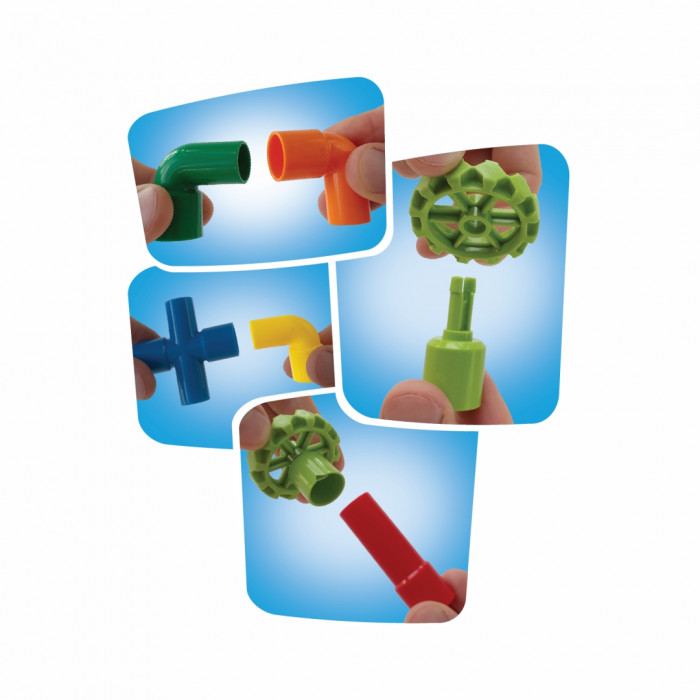 Множество деталей разного цвета и направленности помогут соорудить как плоские, так и объемные конструкции. В лабиринтах "Трубометрика", можно разворачивать боевые действия, прятать сокровища в тайных ходах, строить различные сооружения. А с помощью имеющихся в наборе колес, можно конструировать различные машины.