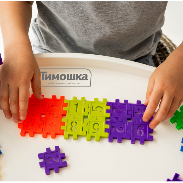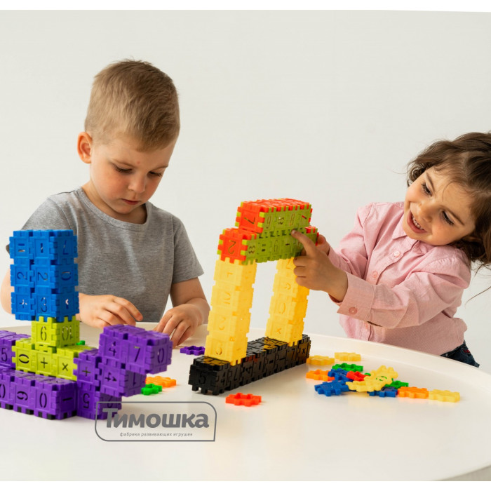 На стенках конструктора изображены цифры и математические знаки, с помощью которых ребенку легко будет освоить числовой ряд и научиться решать примеры с разными математическими действиями, а если задумать строительство по номерам, то получится отличный пазл с закреплением основ математики.