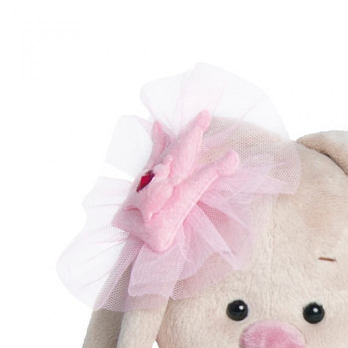 Пышная юбочка-пачка из нежно-розовой сеточки на атласном пояске. На ушке оригинальное украшение — брошка в виде короны с сеточкой и стразом в виде сердечка.