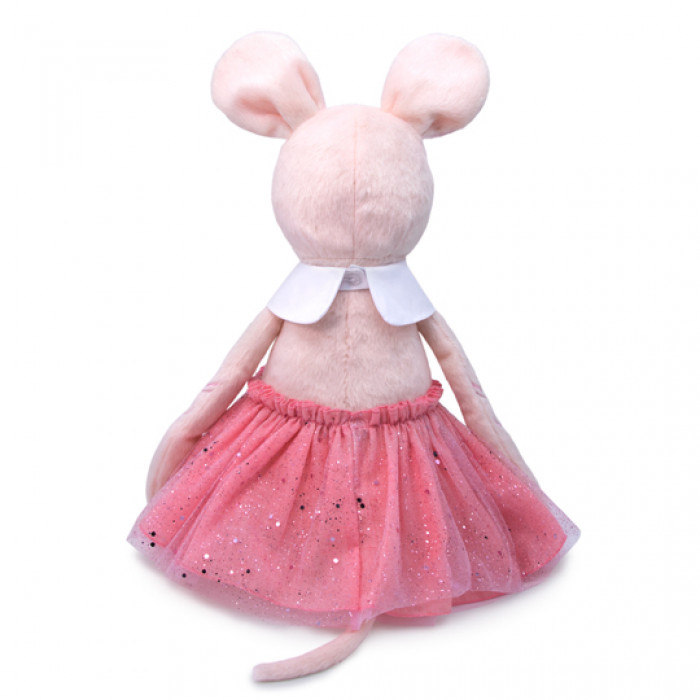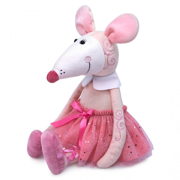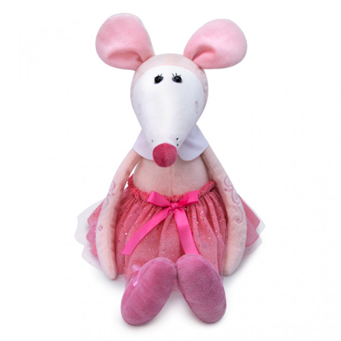Бледно-розовая крыса Лола в нежно-розовых пуантах на атласных лентах и в балетной пачке из сеточки цвета розовой воды с серебристым напылением на подкладе из марлевки. Спереди юбка украшена бантом из атласной ленты цвета розовой камелии. В комплекте — белоснежный хлопковый воротничок.