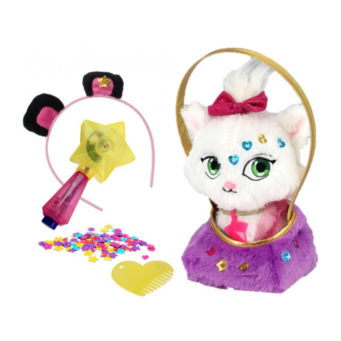 В комплекте есть ободок для девочки, чтобы быть в одном стиле с питомцем, и сумочка, в которой можно переносить питомца или складывать свои аксессуары! Можно использовать и другие аксессуары, например, эластичную резинку для волос и сверкающий браслет со звездочкой (в виде ошейника питомца). Сверкайте вместе!