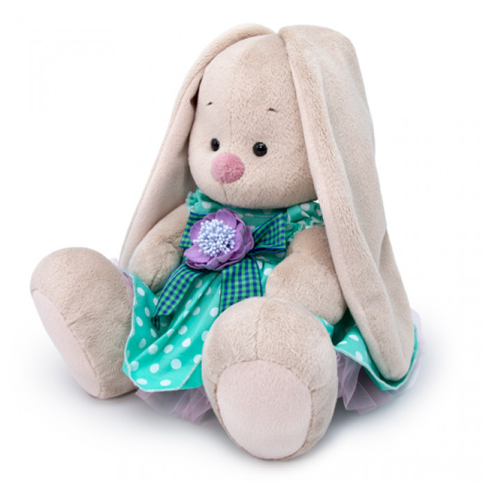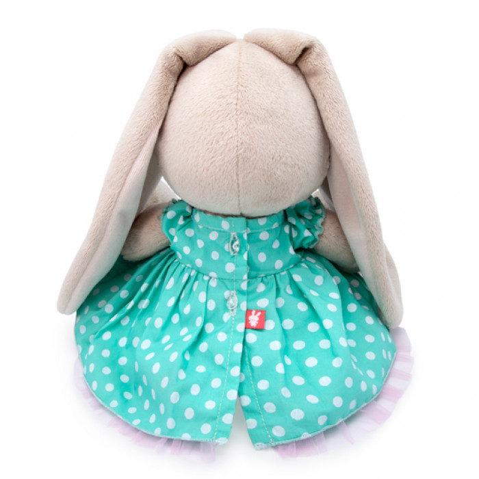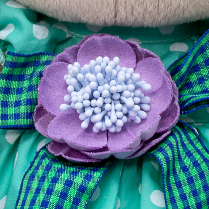 Зайка в милом х/б платьице ментолового цвета в крупный белый горох. Платье отрезное по талии с пышной юбкой и рукавчиками-фонариками. Спереди наряд украшает аксессуар в виде сиреневой камелии с бантом из бирюзовой ленты в мелкую клетку. Платье на подкладе из нежно-сиреневой сеточки.