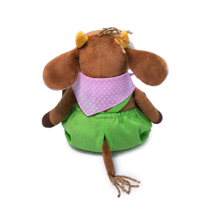 Маленький бычок Гордейв стильном комбинезоне из плотной х/б ткани сочного салатового цвета. Комбинезон сшит на лямочках, с кармашком спереди и отделан контрастной строчкой. Также на шее Гордея повязана косыночка-банданка из нежно-розового хлопка в мелкий белый горошек.
