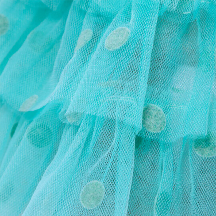 Супер модный комплект, состоящий из шикарной юбки и джинсовой курточки. Пышная юбочка сшита из сеточки мятного цвета в крупный горох. Курточка - из джинсы плотного цвета индиго с декоративной строчкой и яркими пуговками цвета фуксии. На ушке у Зайки бант завязанный из двух атласных лент.