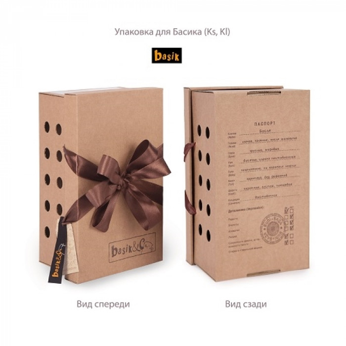 Кот Басик - галантный вислоухий шотландец с трогательными глазками и усиками-ниточками, торчащими во все стороны. По задумке дизайнера глазки у Басика разного размера, чтобы взгляд был мультяшно удивленным. Дымчатый шотландец "живет" в коробке-переноске, изготовленной из плотного крафт-картона. Очень презентабельно и стильно! Как любому породистому коту, Басику положен паспорт. И он имеется на обратной стороне коробки. Составлен с юмором и вызывает улыбку.