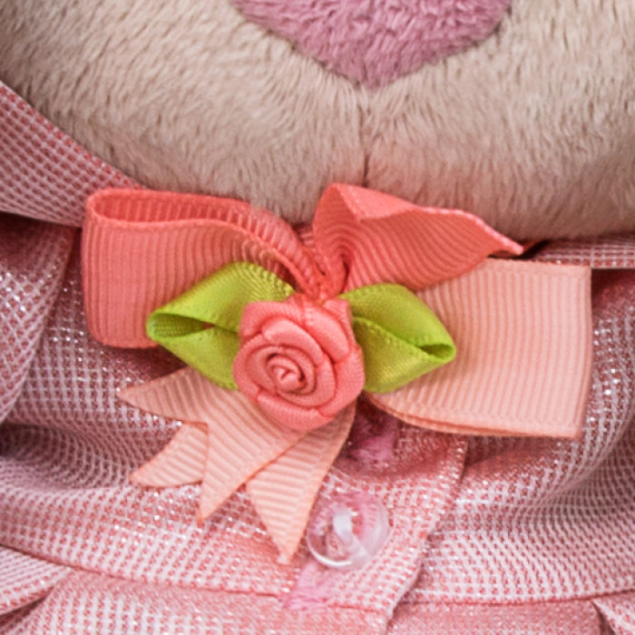 Плащик в пудровых оттенках из плотной с люрексом ткани сшит отрезным по талии, со встречными складками и с капюшоном. Спереди плащик украшен нежным бантиком с атласной розочкой персикового цвета.